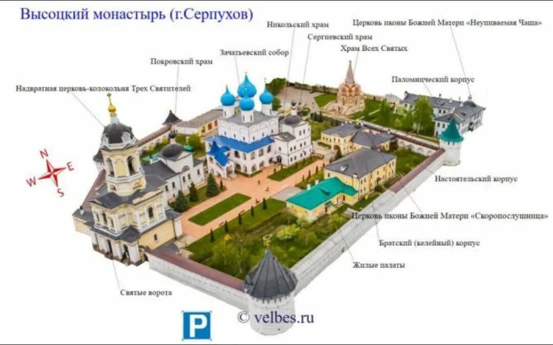Основан он по благословению преподобного Сергия Радонежского в 1374 году Серпуховским князем Владимиром Андреевичем Храбрым, двоюродным братом и сподвижником великого князя Димитрия Иоанновича Донского. Первым настоятелем монастыря преподобный Сергий поставил своего любимого ученика Афанасия. Свое название монастырь получил от места, находящегося на высоком красивом холме, в народе называвшемся «Высокое». Надвратная церковь-монастырь трех святителей. Центральный вход в монастырь, святые ворота. Центральная площадь монастыря. Правее от колокольни Покровский храм. Покровский храм внутри. Зачатьевский собор. Никольский храм. Арка церкви иконы божей матери "скоропослушница". В одной из башен сувенирная лавка. Трапезная. Храм всех святых