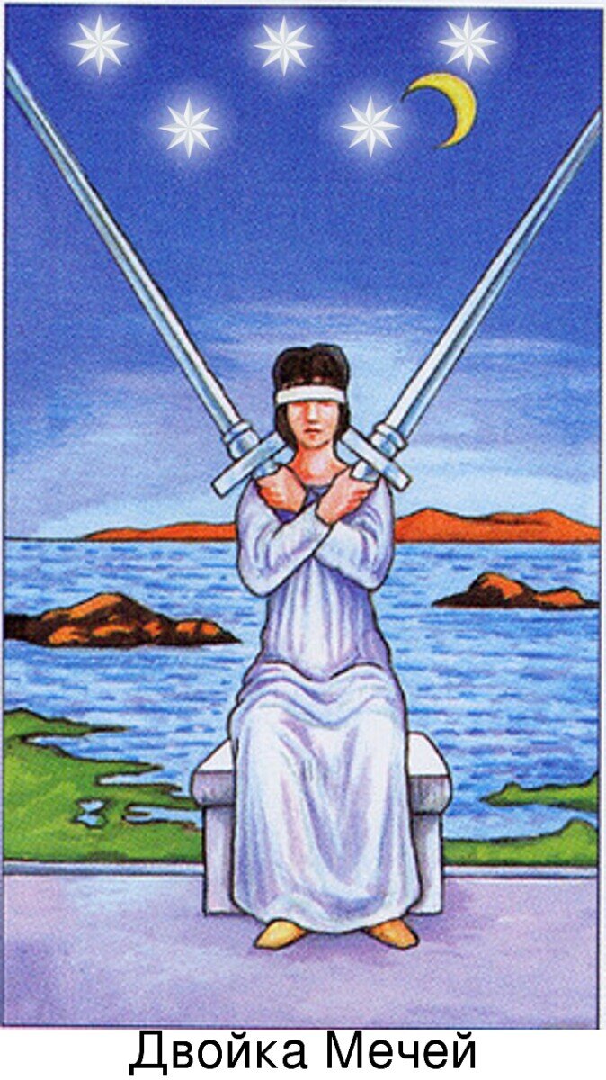 Двойка мечей - одна из таких карт, на которой изображена фигура с завязанными глазами. На этой карте женщина сидит со скрещенными на груди двумя мечами, с завязанными глазами и, по-видимому, в глубоком раздумье. Эта карта символизирует необходимость полагаться на интуицию и внутреннюю мудрость, когда сталкиваешься с трудными решениями или противоречивой информацией.