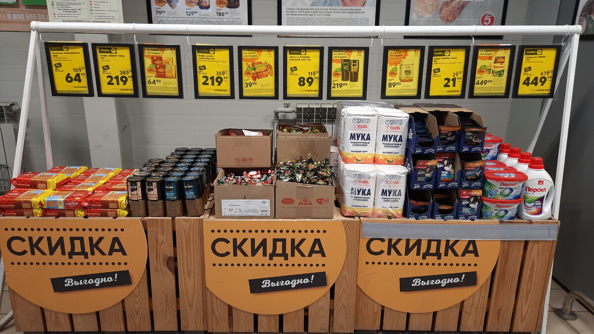 Всем привет, сегодня обзор из Пятерочки.Началась новая неделя скидок .Давайте вместе посмотрим ,какие товары можно купить в Пятерочке по карте со скидкой. Пятерочка находится по адресу Ростовская область, Зерноградский район, станица Мечетинская, улица Ленина, 62. Печенье Юбилейное традиционное витаминизированное 268 г цена по карте со скидкой 64.90 руб. Кофе Жардин Голд растворимый сублимированный 95 г цена по карте со скидкой 219.99 руб. Кофе Жардин Коломбиа растворимый сублимированный 95 г цена по карте со скидкой 219.99 руб. Конфеты Ромашки, Москвичка, Батончики Ротфронт цена за 100 грамм 39.99 руб. Мука С.Пудовъ высший сорт 2 кг цена по карте 89.90 руб. Корм Пурина Феликс 75 г аппетитные кусочки с курицей в желе в ассортименте цена по карте 21.99 руб. Средство для стирки Персил Колор 1,3 л , 3 кг свежесть от Вернель цена по карте со скидкой 449.99 руб. А теперь посмотрим товары у кассы. Крупные шпроты в масле 240 г цена по карте со скидкой 119