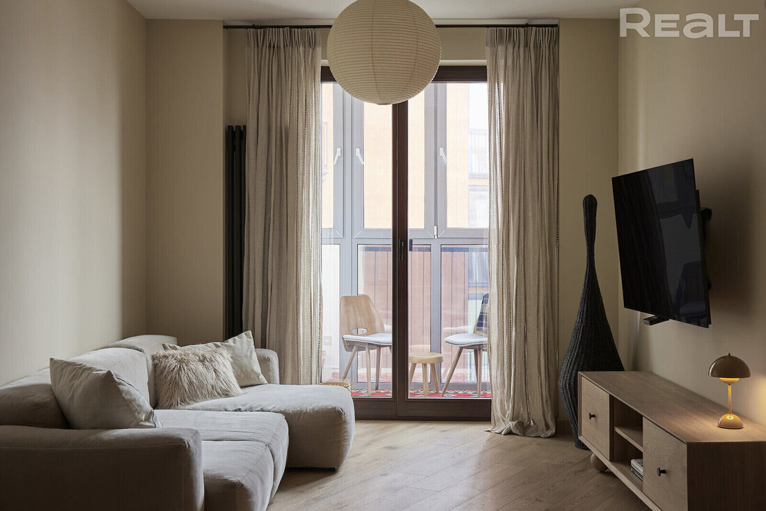В базе Realt появилась квартира со стильным ремонтом в теплых тонах. Все детали интерьера в ней подобраны идеально. Заметил квартиру телеграм-канал «Будни риэлтора». Квартира находится по адресу Быховская, 10. Пять минут до станции «Ковальская слобода» и недалеко от Минск Мира. Это каркасно-блочный 13-этажный дом, который сдали в 2020 году. Квартира на четвертом этаже. В ней 75 квадратов. Две жилые комнаты, есть кладовая. Вот как выглядит планировка. В квартире выполнен стильный ремонт в теплых тонах. На фотографиях все выглядит словно как из журналов. Новым собственникам оставляют абсолютно все, что есть на снимках. Площадь кухни - 11 квадратов. Установлены фильтры очистки воды. Техника - Siemens, AEG и Boch. В комнатах на полу паркетная доска. В гостиной на стене висит телевизор, стоит диван. Есть выход на застекленный балкон. В спальне стоит большая кровать. Установлены дизайнерские радиаторы. Есть рабочее место у окна. Окна, кстати, панорамные. Санузел совмещенный. Установлен душ.