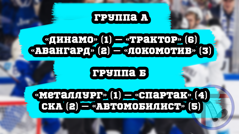 Группа А – серии стартуют 16 марта «Динамо» (1) – «Трактор» (6) «Авангард» (2) – «Локомотив» (3) Группа Б – серии стартуют 17 марта «Металлург» (1) – «Спартак» (4) СКА (2) – «Автомобилист» (5) В этом году нас ждёт уникальный, перекрёстный плей-офф. Особое внимание болельщиков, безусловно будет приковано к паре СКА-Автомобилист. И что-то мне подсказывает, зрительские симпатии не на стороне Петербуржского клуба. Не все может понимают прелесть системы. Трактор сразится с чемпионом «регулярки», Московским Динамо. Как показали их Минские братья, бороться с ними можно. Надеемся, что у Челябинцев, остались эмоции после «Салавата». У «Локомотива», пожалуй, самая сложная сетка, но сложности Ярославцев, только закаляют. «Металлург» в последние матчи не впечатлял, но вполне возможно, сил у них в запасе предостаточно. На бумаге, запад выглядит фаворитом. Но давайте признаем, Восток, всегда считал, что сетка у нас сложнее. И сейчас, появляется хорошая возможность, щёлкнуть по носу братьев с Запада.