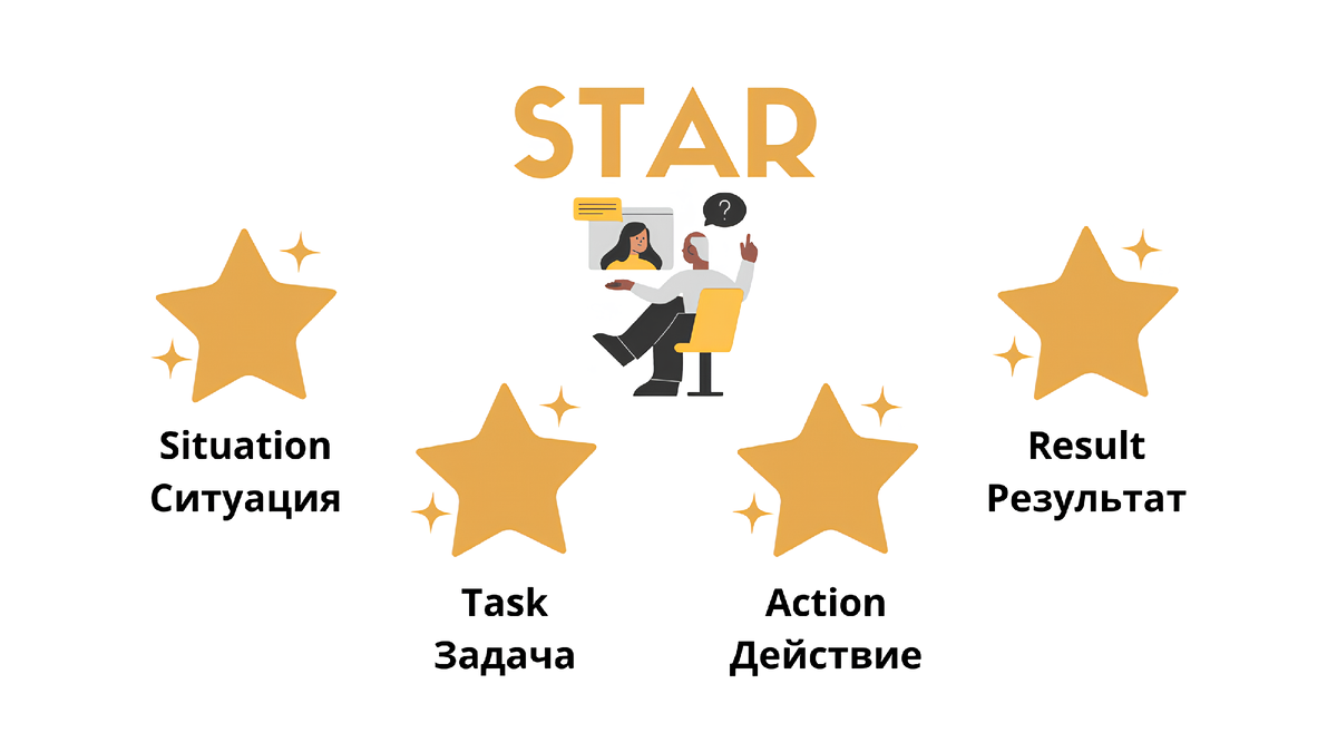 STAR расшифровывается как Situation (Ситуация), Task (Задача), Action (Действие) и Result (Результат). И все эти элементы должны быть отражены в вашем ответе на интервью, чтобы полностью передать, в каком контексте, что и зачем было сделано, а также какой результат это принесло.