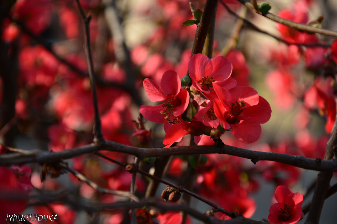 Красными яркими цветами радует японская айва (хеномелес), украшая городские улицы.