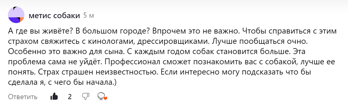 Мы с сыном боялись собак. Очень. Несколько лет назад на нас напала стая из пяти особей. Надо сказать, что если бы не проходящий мимо неравнодушный мужчина, то нам бы, скорее всего, от этих собак досталось, потому что я тогда среагировала на них не совсем правильно. После такого неприятного опыта у нас появился страх собак. Мне сложно выразить как именно мы этот страх проявляли, но разные собаки нас постоянно облаивали и это не прибавляло нам с сыном спокойствия. У меня про этот опыт была отдельная статья, а один из читателей написал к этой статье спасительный комментарий: Да, специалисты кинологических клубов работают с людьми, травмированными неудачным опытом взаимодействия с собаками. И это настолько круто, что делюсь этим с вами. Найти кинологический клуб Это очень просто сделать через поисковые запросы. В нашем районе оказывается расположен областной кинологический центр дрессировки и спорта. Я связалась с руководителем этого центра через ВК, озвучила нашу проблему и очень быстро п