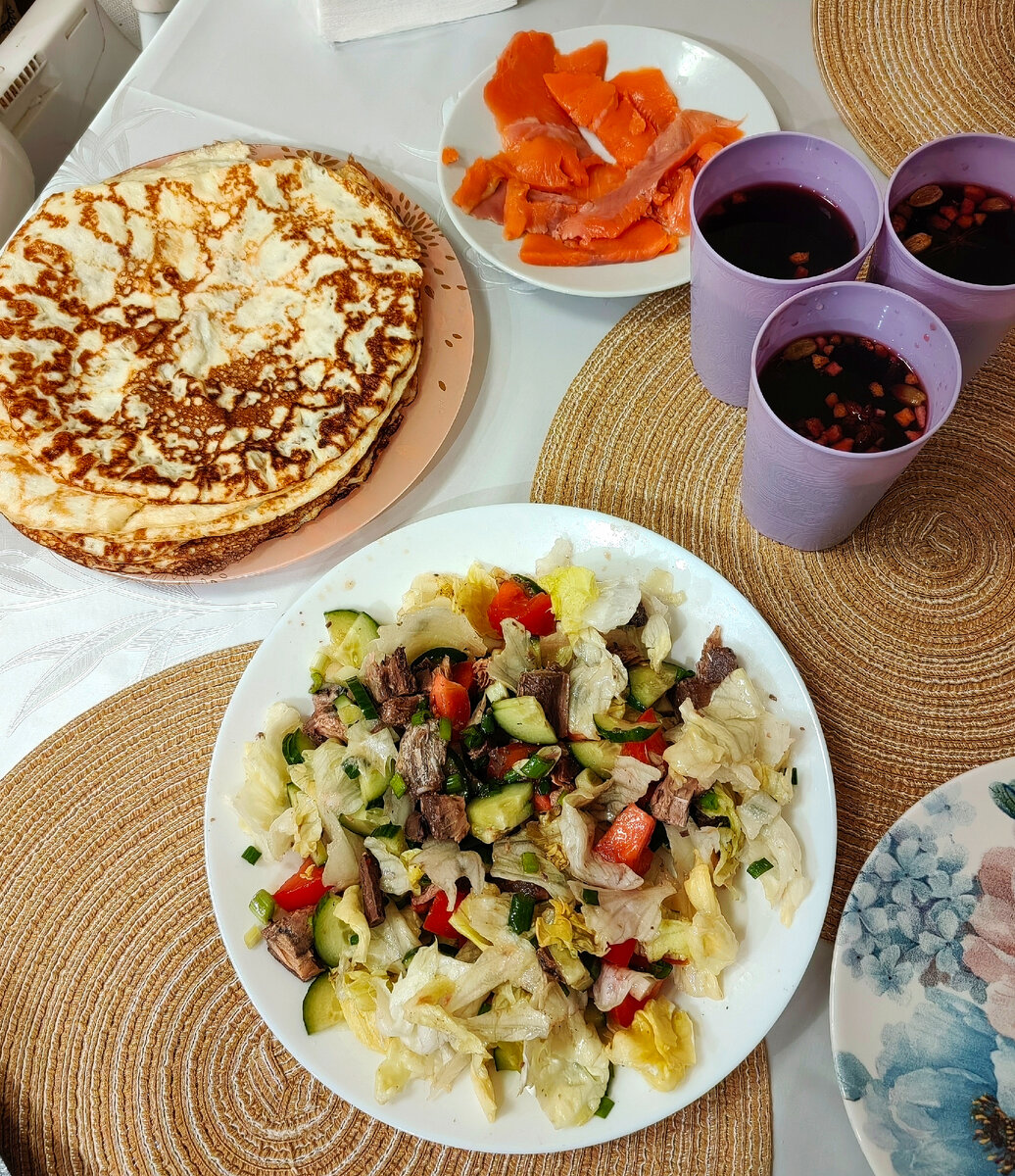 С глинтвейном же и отужинали. Ели блины с рыбой и овощной салат с тунцом.