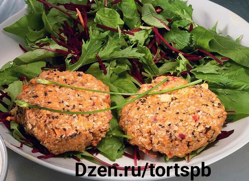 Beганские бургеры из моркови, подсолнечных семян и кунжута с зеленым салатом и свеклой