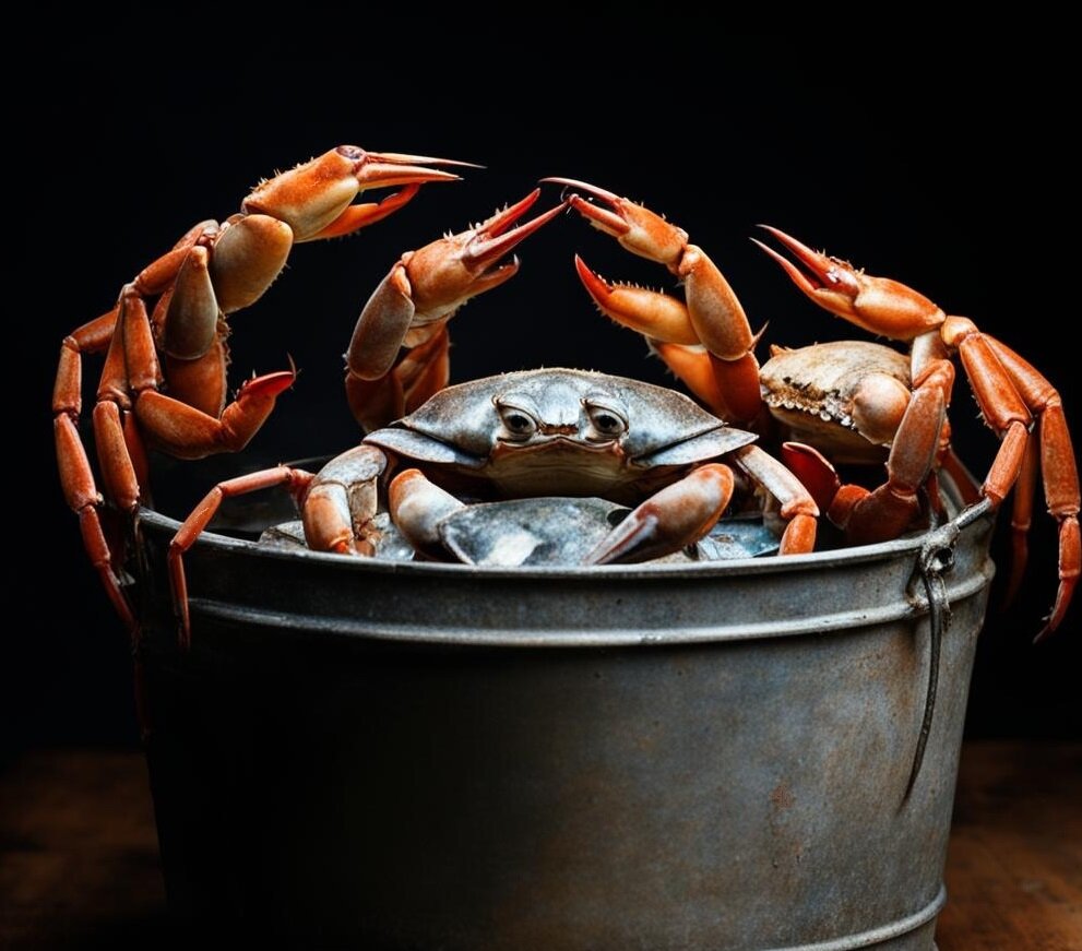Crab bucket theory — «теория ведра с крабами». Эта теория гласит, что крабы — настолько глупы, что по одиночке каждый из них легко бы выбрался из ведра, но когда один из них пытается это сделать, его же сородичи цепляются за него и затягивают обратно. Когда человек пытается переехать в другой город и обустроиться там, а дружки говорят «всё равно не получится» — crab bucket. Когда ты получаешь второе высшее образование, а коллеги громко удивляются, зачем тебе это надо, ведь на работе и так устаёшь — crab bucket. Когда твои собственные родители говорят тебе, что ты глуп (неудачник, бездарь, ничего путного не выйдет) — да-да, crab bucket. Это человеческая природа, и ничего с ней не поделать, кроме одного — быть сильнее ведра и лезть вперёд, даже когда тебя тянут назад сто человек.