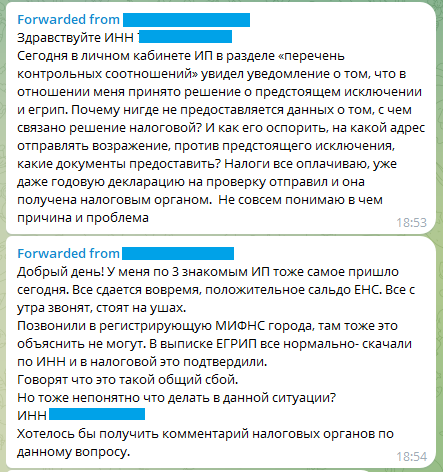 Вчера многие ИП, зайдя в свой личный кабинет, обнаружили сюрприз от налоговиков — уведомление о том, что в отношении предпринимателя принято решение о предстоящем исключении и ЕГРИП. Народ начал массово писать об этом в телеграм-чате ФНС. Задавали вопросы: на каком основании, что делать, как оспорить: ФНС не отвечала. Затем при попытке входа ЛК стал выдавать сообщение об ошибке: Позднее в чате стали появляться сообщения, что уведомление исчезло. Видимо, это был какой-то сбой. Что всё устранили — хорошо. Но тот факт, что контролеры никак не прокомментировали ситуацию, настораживает. А вас коснулось или не заметили? Расскажите нам в Телеграм. В каких ситуациях возможно исключение ИП из реестра по решению налоговой, как происходит этот процесс и каковы последствия исключения, читайте в готовом решении от «КонсультантПлюс». Пробный доступ к системе бесплатный.