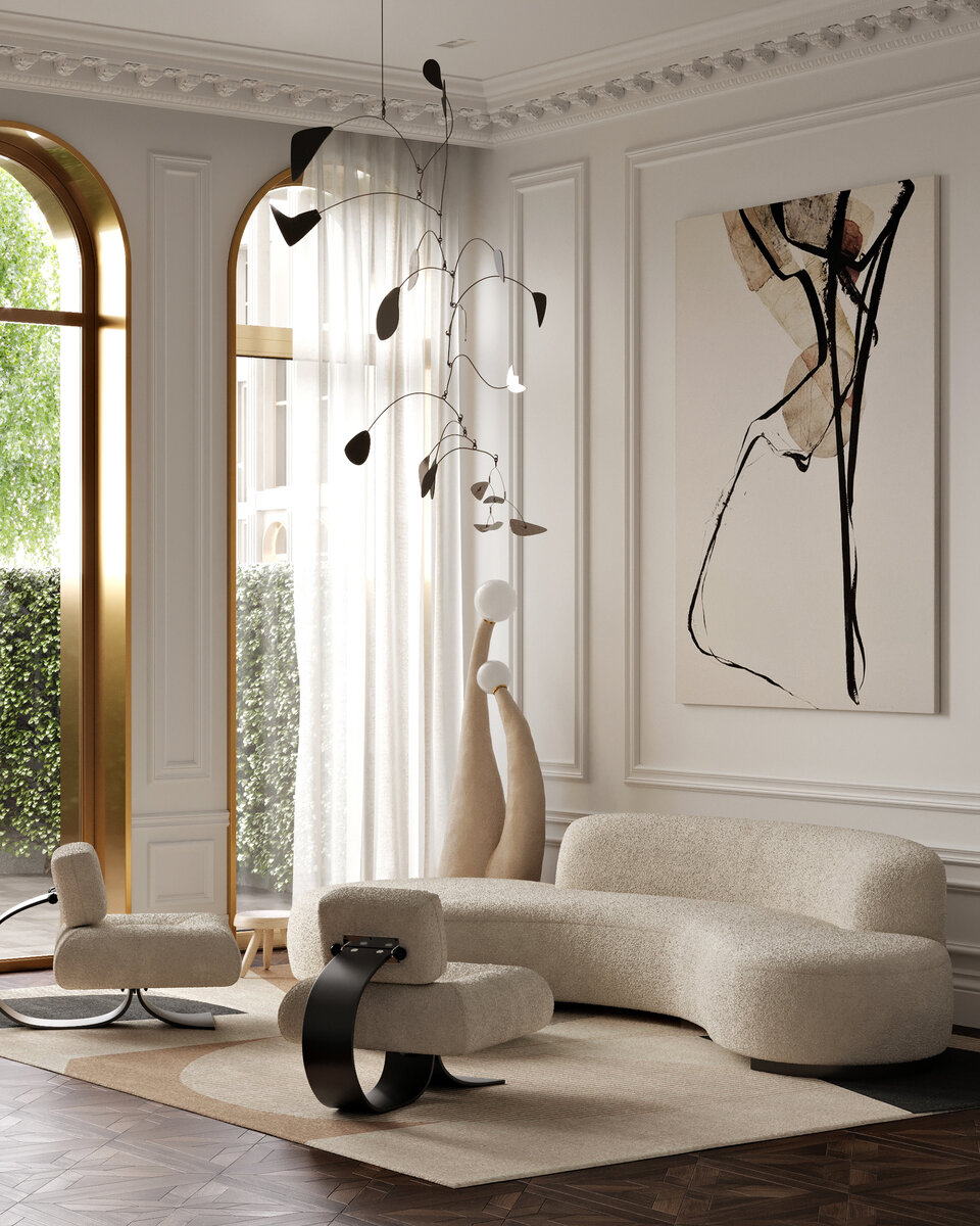 Cameo — это последняя частная вилла в самом центре Москвы. Уникальная архитектура Cameo Moscow Villas — это оазис загородной жизни в центре одного из самых густонаселенных городов мира. Высокие 4-метровые потолки и впечатляющие золотые арочные окна в сочетании с коллекционными предметами легендарных дизайнеров XX века позволили создать пространство мечты. Интерьер выполнен в стиле модерн середины века, наполнен светом и спокойствием. Бело-бежевая палитра зрительно увеличивает и наполняет большое пространство воздухом. Идею арок, заимствованную из архитектуры, дизайнер Роман Плюснин решил многократно повторить в интерьере. Эта техника позволяет добиться прочных взаимоотношений между всеми предметами интерьера. История начинается со знаменитой «Мобильной скульптуры» Александра Кальдера, которая плавно перетекает в похожие узоры в искусстве художника Китти Сабатье, диван Владимира Кагана превращает витиеватые линии в формы, а игру в трехмерное пространство, поддерживаемое ею. Два стула Ос