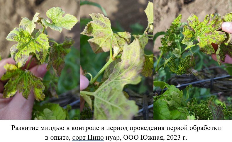 Милдью Plasmopara viticola. Первичное заражение винограда милдью в условиях анапо-таманской зоны виноградарства Краснодарского края произошло нетипично рано до цветения, в фенофазу начала разрыхления соцветий, чему способствовала теплая и влажная весна. Благоприятная погода мая (t 13…20°С, осадки 60,6 мм), июня (t 18…26°С, осадки 88,0 мм) и июля (t 20…30°С, осадки 62,0 мм) способствовала очень высокой скорости развития заболевания в этот период, особенно на восприимчивых сортах. Поэтому в наиболее вредоносной форме милдью отмечалось именно на самых восприимчивых сортах винограда, таких как группа Пино.