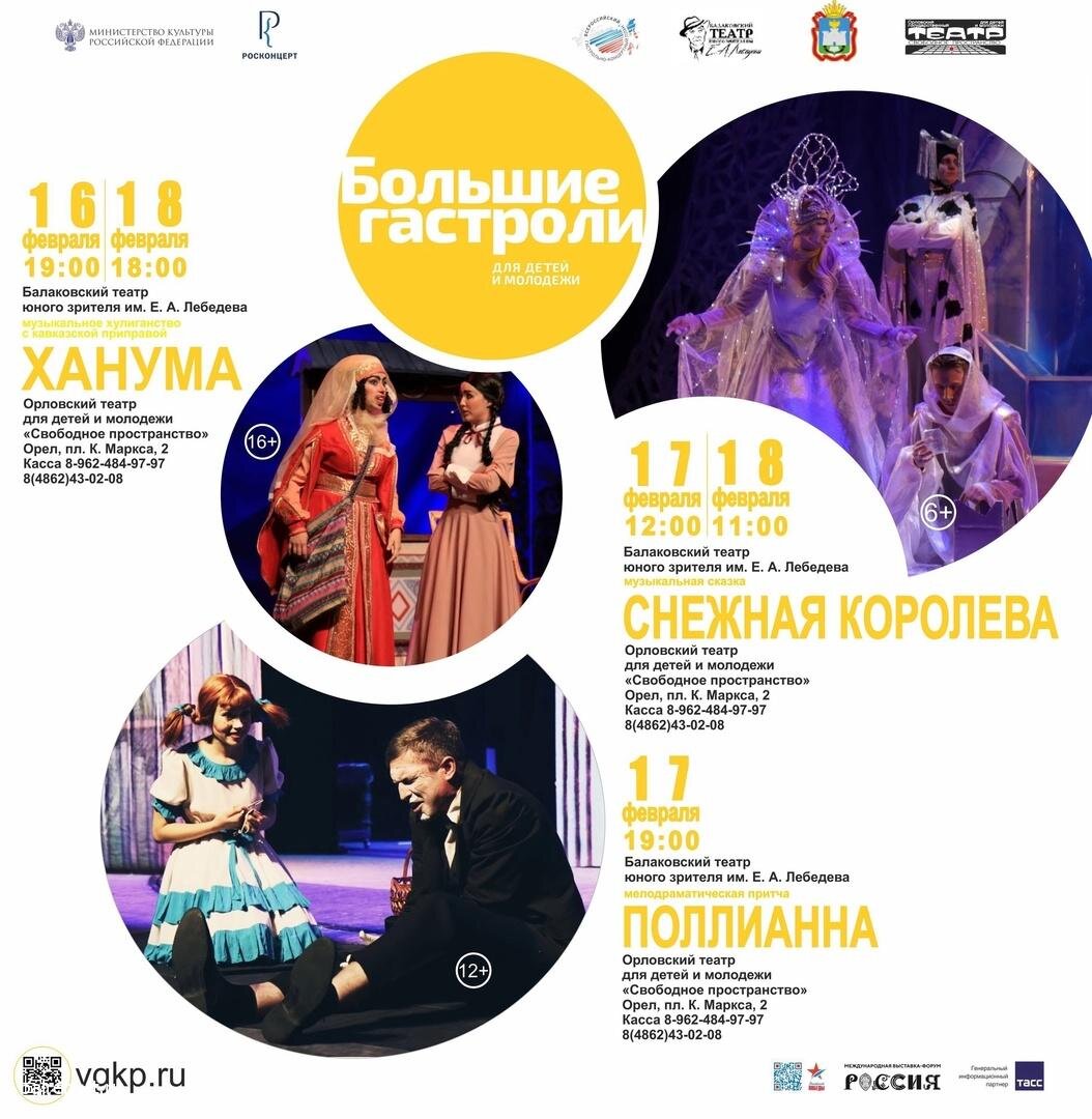Актёры из Балакова представят три спектакля Балаковский театр юного зрителя отправился на гастроли в г. Орёл, где в рамках программы «Большие гастроли» наши артисты покажут местным зрителям спектакли «Поллианна», «Ханума» и «Снежная Королева». Спектакли будут проходить 16-18 февраля на сцене театра для детей и молодёжи «Свободное пространство». Напомним, что программа «Большие гастроли» стартовала в 2014 году. Организатором является Росконцерт. Благодаря этому зрители даже самых отдаленных городов и малых населенных пунктов получили возможность знакомиться с лучшими постановками российских и русских зарубежных театров, с концертными программами выдающихся отечественных коллективов. Так, в 2023 году в 89 регионах России состоялись гастроли 277 театров и 66 коллективов, прошли показы 2474 спектаклей и концертов. Кроме этого и театры из небольших городов, таких, как Балаково, могут представить свои спектакли в других регионах.