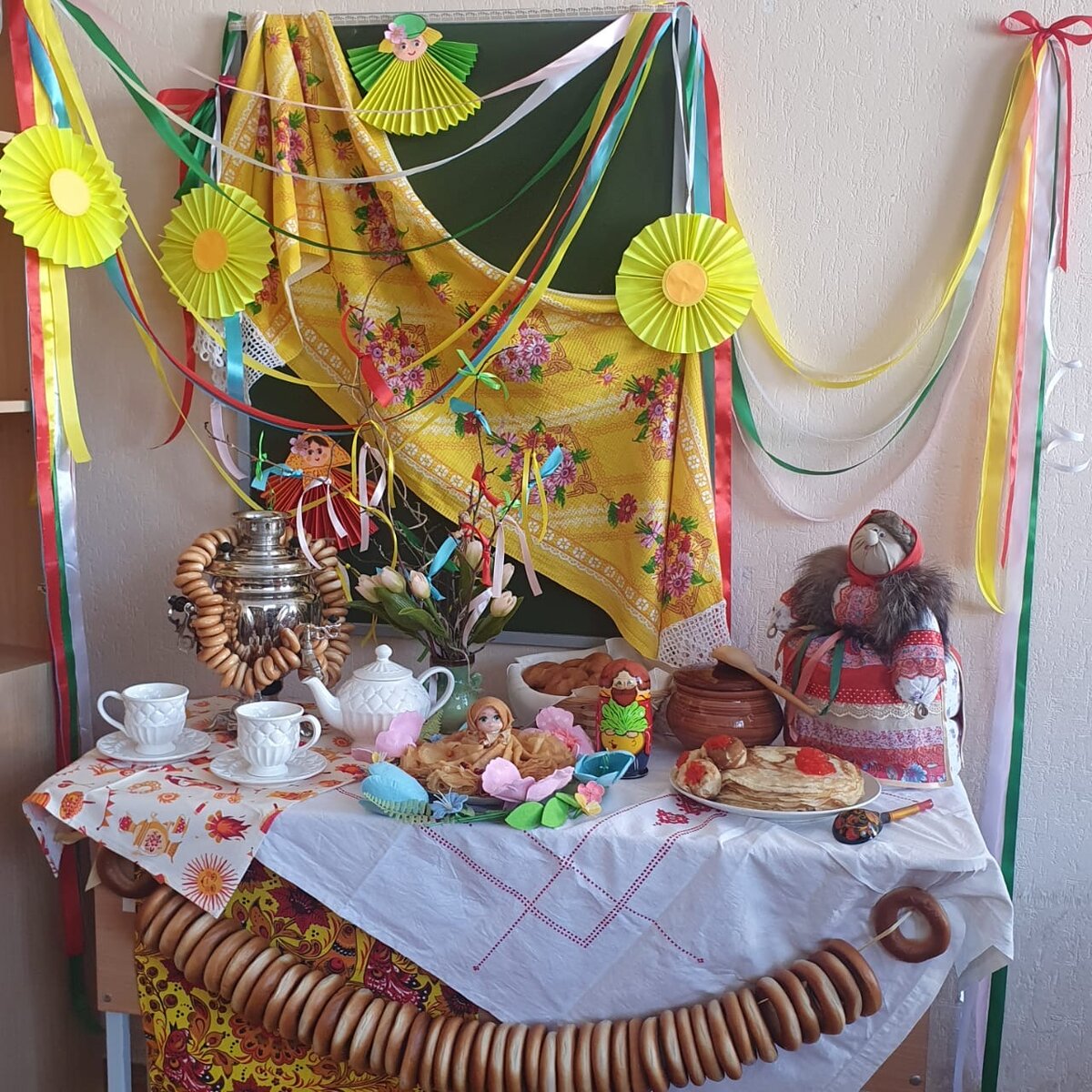 В школе у сына устроили конкурс фотозон к Масленице Я сделала бумажные украшения Другие родители принесли самовар, посуду, ленты, скатерти баранки и конечно блины. Вот такой нарядный стол получился ☀️