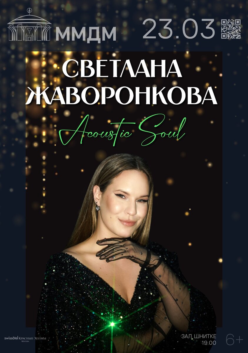 В связи с трагическими событиями, концерт перенесен на 27 апреля в 19:00 в зале Шнитке ММДМ. Все купленые билеты - действительны. А на сайте ММДМ еще остались в продаже билеты разных категорий https://www.mmdm.ru/event/svetlana-zhavoronkova-acoustic-soul?event_pk=4445&utm_source=zhavoronkova_ru&utm_medium=organic&utm_campaign=buyticketbutton Светлана Жаворонкова - московская певица и автор песен, резидент Клуба Алексея Козлова и основных джазовых фестивалей по всей стране, ведущая авторской рубрики "История одной песни" на Радио Jazz, участница шоу "Голос" и "Ну-ка все вместе!", лауреат международных конкурсов эстрадно-джазового вокала Усадьба Jazz-2016, "Новое поколение"-2015. Проект Acoustic Soul уникален не только своим разнообразным, но очень выверенным репертуаром, но и звучанием: вместо барабанов используется кахон и перкуссия, вместо электрогитары- акстическая, часто в аранжировках используются тембры Rhodes-piano и Hammond-органа, а основной солирующий инструмент - флейта! В с
