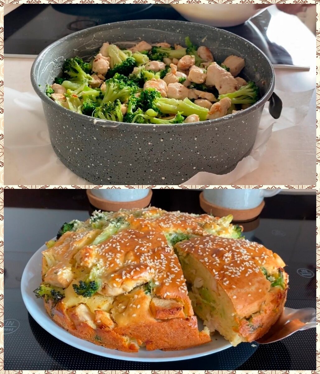 🔸Специи и приправы по желанию Как приготовить заливной пирог с брокколи и курицей Брокколи разбираем на мелкие соцветия и заливаем холодной подсоленной водой. Оставляем на 15-20 минут. Чеснок режем мелим кубиком. Куриное филе режем небольшими кусочками. На сковороде разогреваем немного растительного масла и обжариваем чеснок до того момента, как он начнет отдавать свой аромат. Добавляем куриное филе и обжариваем в течение 7-10 минут на среднем огне до появления легкой золотистой корочки. За 1-2 минуты до готовности солим по вкусу и