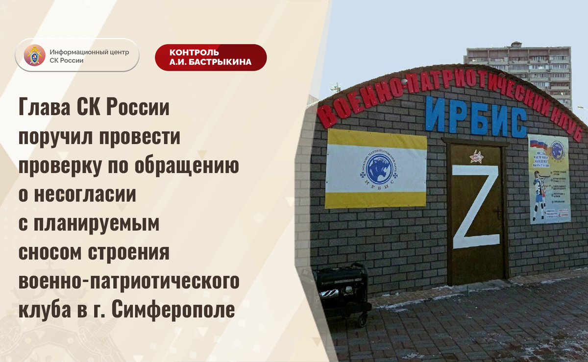 В комментариях в аккаунте Информационного центра СК России «ВКонтакте» поступило обращение, в котором выражается несогласие с планируемым сносом здания детско-юношеского военно-патриотического клуба «Ирбис» в городе Симферополе. Сообщается, что в 2021 году в помещении, в котором занимаются дети, прекращена подача электроэнергии, а в дальнейшем принято решение о демонтаже строения.