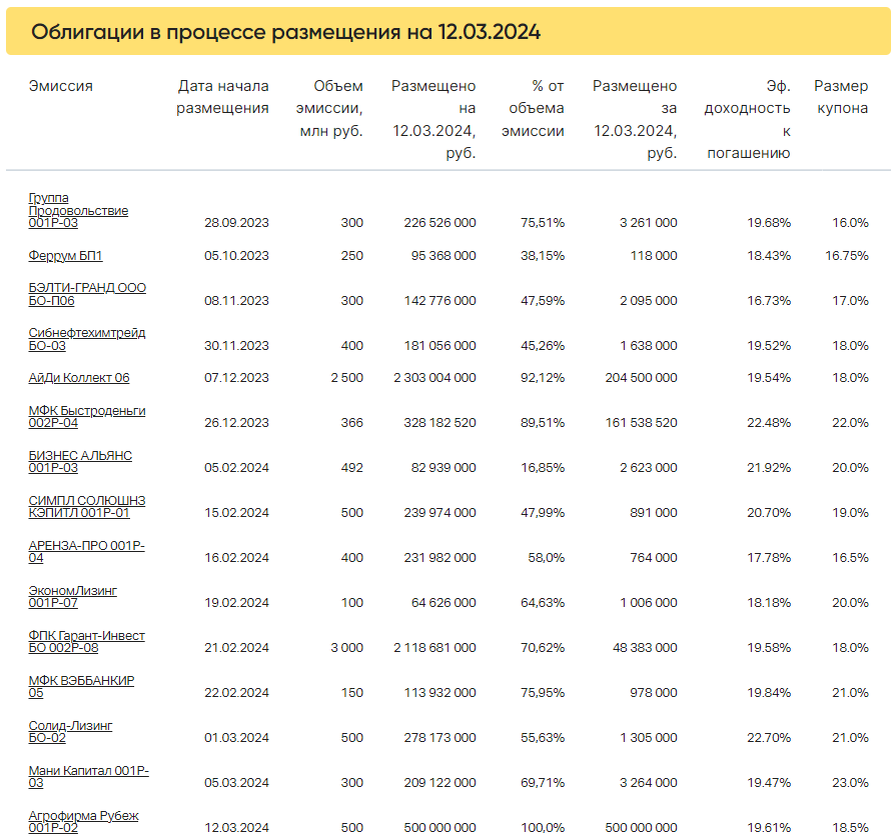 12 марта стартовало размещение пятилетних облигаций Агрофирма Рубеж 001Р-02 объемом 500 млн рублей. Выпуск был полностью размещен в первый день торгов за 3 444 сделки, средняя заявка 145, 2 тыс. рублей.