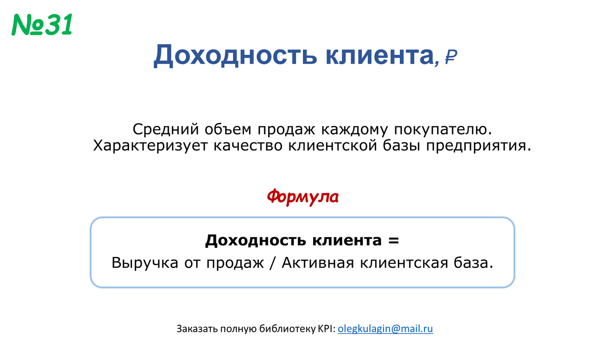 Показатель "Доходность клиента" (или средний объем продаж) характеризует (в среднем) качество клиентской базы. Другими словами, он показывает, насколько крупные у вас клиенты, т.е. в каких объемах они совершают у вас покупки. Динамику этого показателя важно отслеживать. Если вы хотите повысить качество клиентской базы, можете использовать этот показатель как KPI для отделов продаж. Архив показателей Полная библиотека KPI