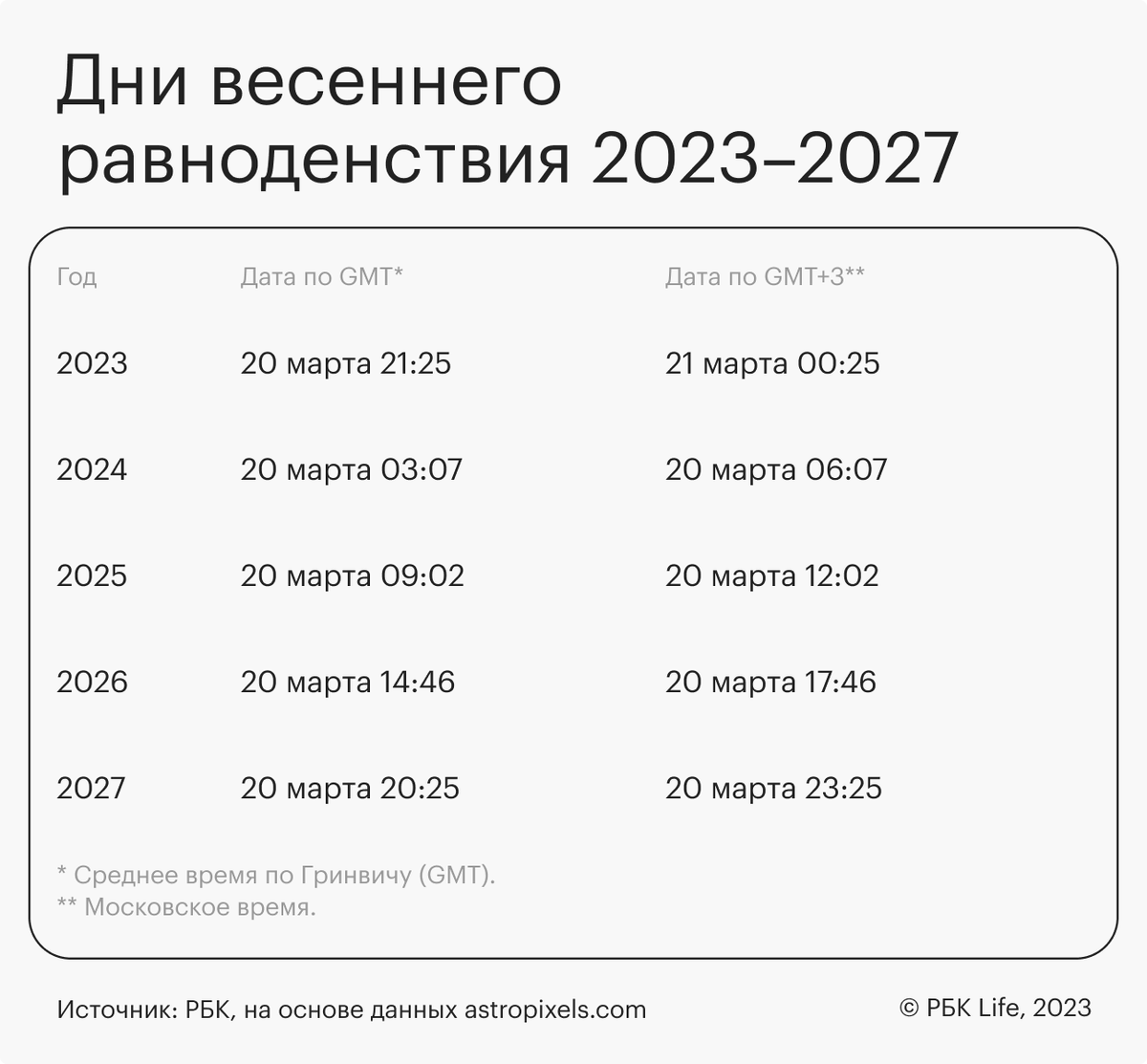 День равноденствия — это время, когда продолжительность дня и ночи практически одинакова во всем мире, после весеннего равноденствия официально начинается астрономическая весна. РБК Life рассказывает, когда ждать весеннего равноденствия и как можно объяснить явление с научной точки зрения. В 2025-м день весеннего равноденствия наступит 20 марта в 12:02 по московскому времени. Дата и время меняется год от года: чаще всего равноденствие в Северном полушарии наступает в период между 19 и 21 марта по Гринвичу. Среднее время по Гринвичу (GMT) — это астрономическое время меридиана, где ранее находилось здание Гринвичской обсерватории в Лондоне. Считается общемировой точкой отсчета для всех часовых поясов. Точное время наступления дня равноденствия также зависит от часового пояса. За основу для расчетов берут время по Гринвичу и добавляют или убавляют часы в зависимости от местоположения. Например, по Гринвичу (Лондон) весеннее равноденствие в 2025-м наступит 20 марта в 09:02. Время между Лон