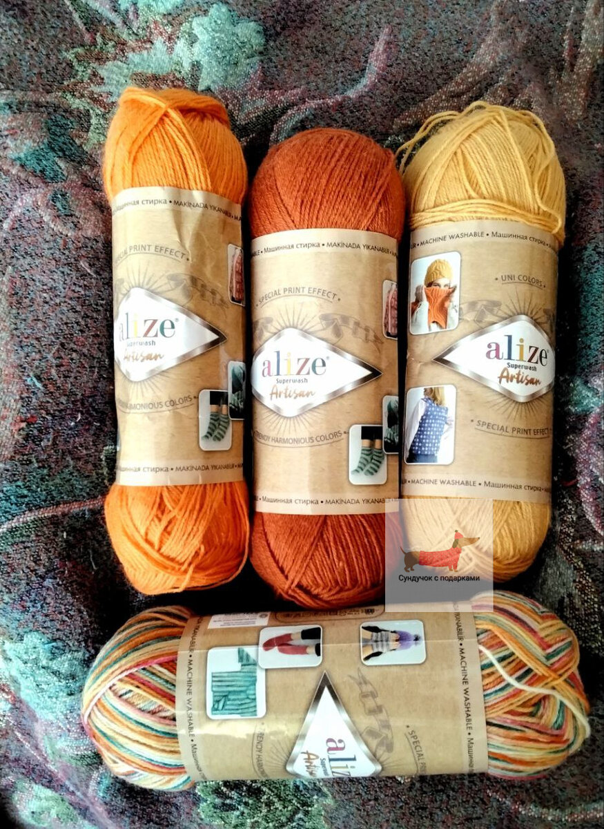 Вчера получила посылку с пряжей. Заказала для новой шали пряжу Alize Superwash Artisan. У пряжи хороший для вязания шалей состав: 75% шерсти и 25% полиамида. В 100г — 420 м. Вязать рекомендуется на спицах 2-4мм. Мне давно хотелось самой повязать из этой пряжи, слышала о ней много отзывов. Палитра пряжи Ализе Superwash Artisan собрала интересные трендовые цвета, которые прекрасно подходят друг к другу, гармонично и эффектно сочетаются в различных комбинациях. Я заказала цвета для новой шали, мне нужно было 3 сочетающихся цвета в жёлто-терракотовых тонах. Очень рада, что яркие цвета оказались несколько приглушёнными, я боялась, что они будут слишком яркие. Смешанный купила, чтобы посмотреть как ложиться цвета в этой серии. В мотках пряжа кажется мягкой, приятной на ощупь, без колкости. На этикетке указано, что изделия можно стирать в машине. Вязать из пряжи мне понравилось. Вяжу на спицах 3,5 мм. Пробовала на 4 мм, но получается очень рыхло, плохо смотрится рисунок. Пряжа средней скрутки