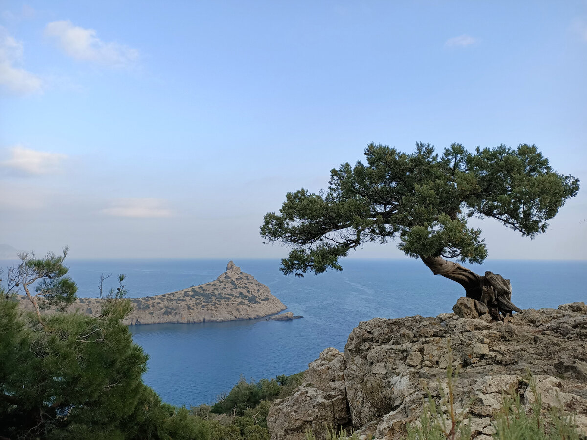 Восторг! СТРАХ! Как я уже писал в предыдущей статье, предугадать маршрут на пик Космос у меня не получилось! Посмотрев на горы, попробовав их на глаз, отложил сам поход на следующий день! А что получилось? Читайте здесь! В Заказнике "Новый свет" три маршрута: 1. Вокруг горы с посещением грота Шаляпина и мыса Капчик. 2. Царский пляж. 3. Пик Космос, кресло Голицына, лестница Тавров и масса всяких интересностей. Сегодня о третьем маршруте, к которому ведёт хорошая тропа... Путешествие по хорошо оборудованной тропе... с ограждениями и лавочками по утоптанной дорожке закончилось достаточно быстро: около знака, который указывал разветвление на два направления - на Царский пляж и к селу Весёлое. Путь к пику Космос, который находится почти на половине пути до села Весёлого, но это на мой взгляд самая интересная его часть. Вторую часть пути по склону горы с прекрасными видами на мыс Капчик нельзя также назвать трудной. Только изредка приходилось перепрыгивать через камни, а так дорога была ро