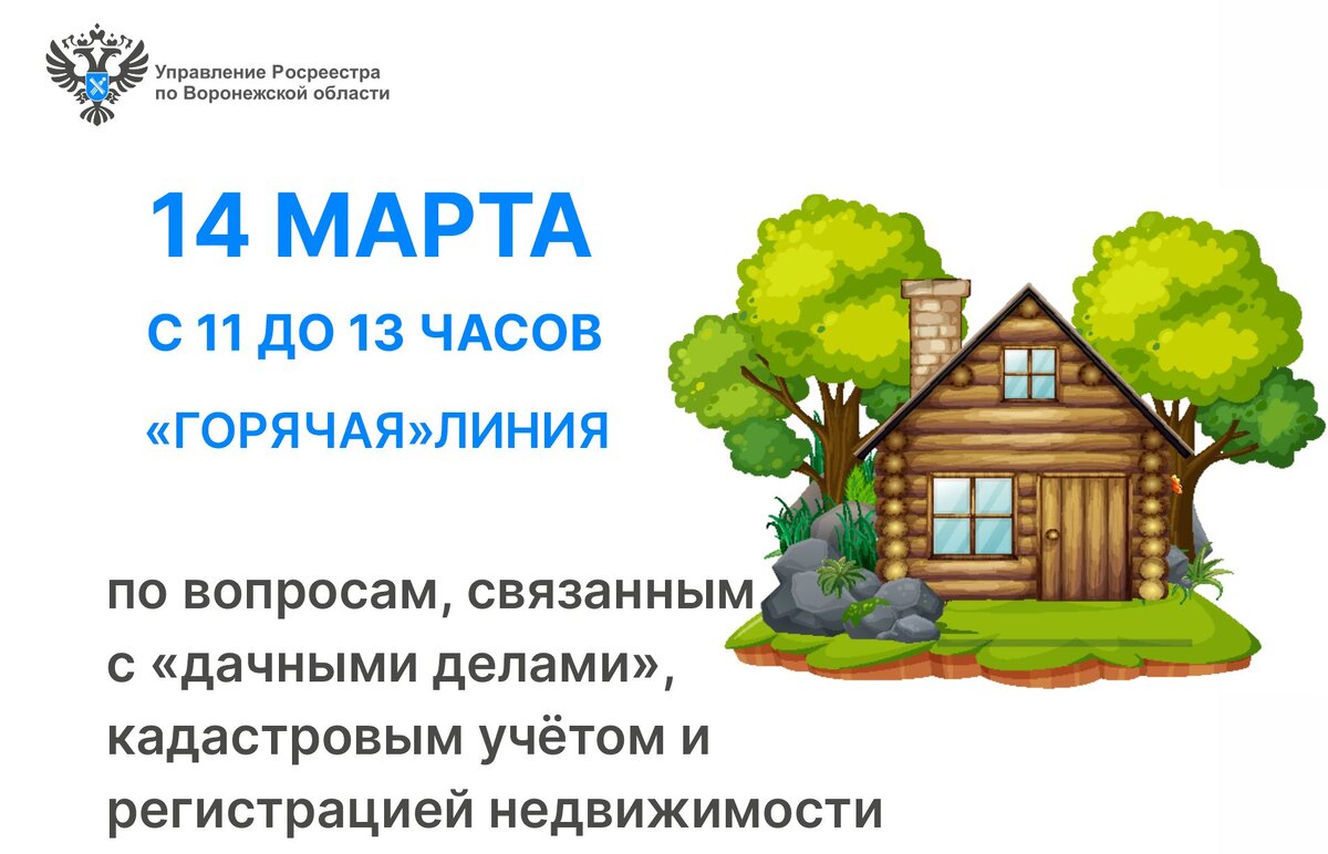 В четверг, 14 марта, с 11:00 до 13:00 Управление Росреестра по Воронежской области и Филиал ППК «Роскадастр» по Воронежской области проведут «горячую» линию, где ответят на ваши вопросы, связанные с «дачными делами», кадастровым учётом и регистрацией недвижимости.