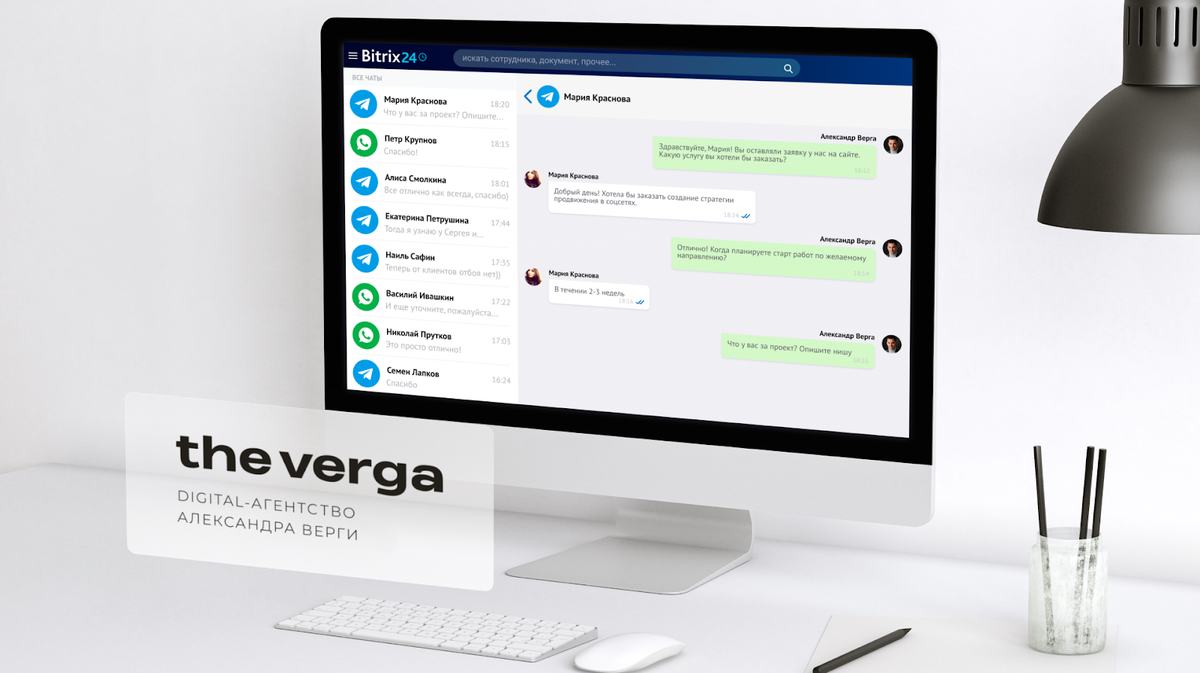 Как клиенту удалось избавиться от рутины и увеличить конверсию в клиента с помощью интеграции WhatsApp* и Telegram с CRM-системой. О клиенте Digital-агентство Александра Верги под названием «the Verga» занимается контекстной и таргетированной рекламой в Яндекс Директе, ВКонтакте, Telegram и Instagram*. За пять лет работы было реализовано более 300 проектов. Среди заказчиков: MIXIT, Francesco Donni, гипермаркет «Линия» и другие. Так выглядит сайт агентства the Verga Как осуществляется связь с покупателями? Большая часть клиентов приходит через сайт. Там они заполняют форму заявки, указывая свои личные данные и вид услуги, которую им хотелось бы получить. Кроме этого, люди выбирают предпочтительный способ связи: WhatsApp*, Telegram или звонок по телефону. Виджет со способами связи на сайте the Verga Обычно люди выбирают мессенджеры, для многих это наиболее удобный способ связи: Проблемы агентства Ручной перенос заявок из мессенджеров в CRM-систему. Когда клиент пишет в WhatsApp* или Tel