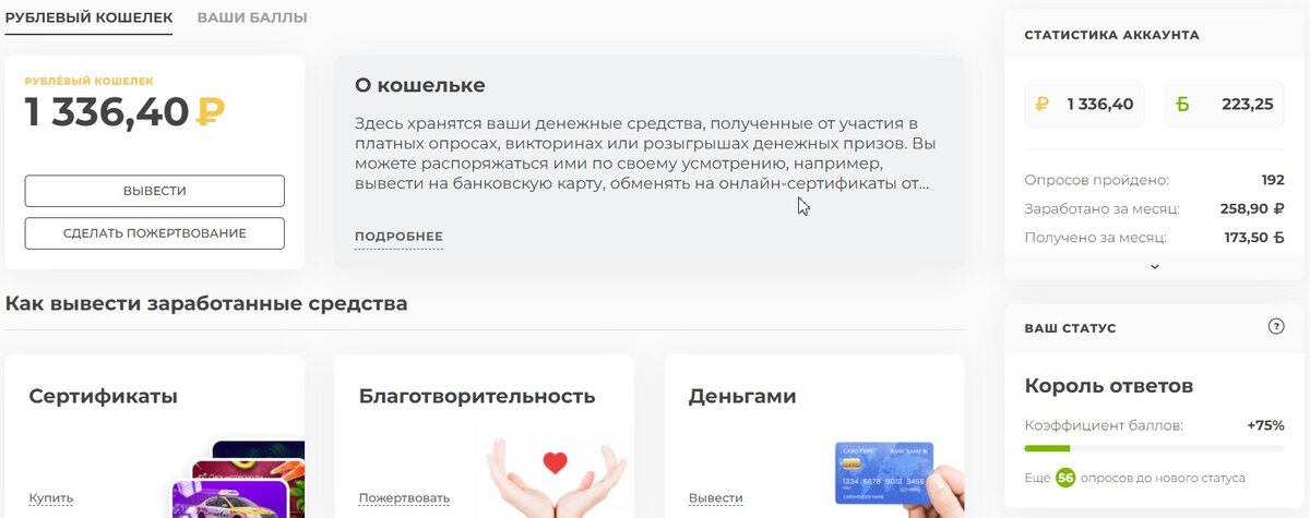 Деньги, которые заработали тут, можно потратить на благотворительность, получить в виде сертификата на покупки в в весьма приличное количество магазинов, а так же получить деньгами.