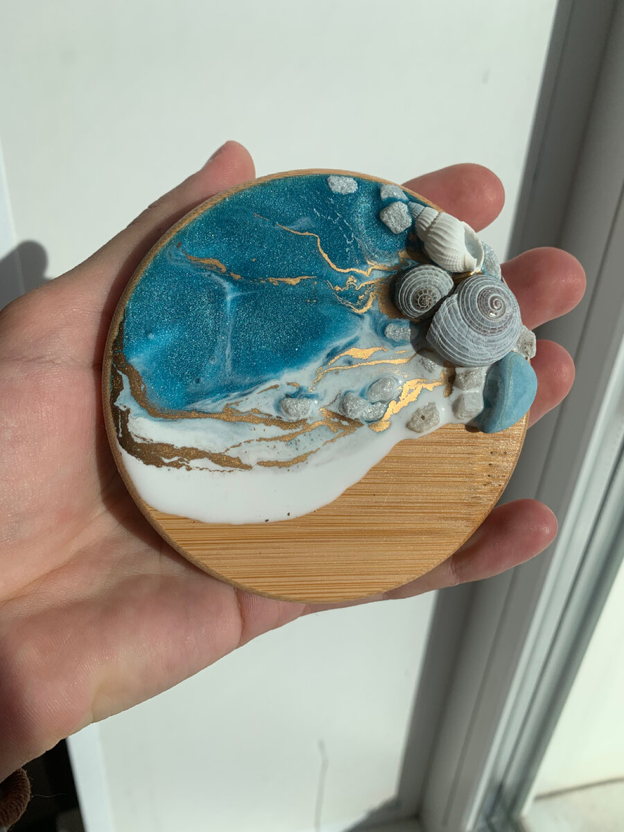 Как я эпоксидной смолой подарки к новому году заливала. мое знакомство со смолой началось 5,5 лет назад. Я начинала в студии, работая преподавателем мастер-классов по эпоксидной смоле( разных направлений), чуть позже сделаю отдельный пост! А сейчас про мое недавнее творчество. Буквально под Новый год встал вопрос, а как поздравить маму и свекровь? Нашла на вб заварник с приятными бамбуковыми крышками. Имея набор Вязкой эпоксидной смолы тоже заказанной с вб (1400 руб за набор, литр смолы +500 мл отвердитель) и набор красителей ( покупала лет 5 назад 100 руб за флакон). Золотой Порошок покупался на алиэкспресс ( 50 руб баночка) Ракушки и камушки были собраны летом на пляже, благо живу в Приморье) Из всех материалов был использован минимум. Дизайн, то что получилось- чисто импровизация, рисунок поправлялся вначале зубочистками, пока смола не начала густеть. На этом этапе были уложены ракушки и использован золотой Порошок. Сохло чуть больше суток . Вот такие чудесные крышечки получили