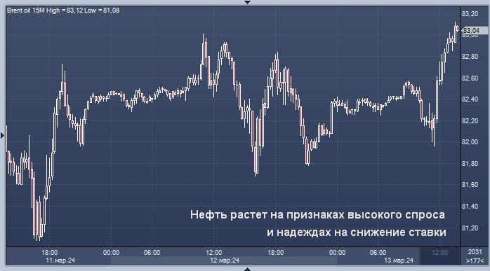 Некоторые аналитики не понимают, почему цены на нефть не растут более значительно при таких бычьих факторах График нефти Brent интервалами в 15 минут Нефть подорожала в среду, поддерживаемая признаками высокого мирового спроса, в том числе со стороны главного потребителя - США, а надежды на то, что Федеральная резервная система скоро начнет снижать ставки, также способствовали росту настроений, несмотря на несколько неустойчивую инфляцию в США. На прошлой неделе запасы сырой нефти и топлива в США сократились, что свидетельствует о высоком спросе, сообщили источники на рынке со ссылкой на данные Американского института нефти в преддверии официального отчета о запасах в США, который выйдет в среду. Фьючерсы на нефть Brent на май выросли на $1,18 цента, или на 1,44%, до $83,10 за баррель к 13:38 мск. Американская нефть West Texas Intermediate с поставкой в апреле подорожала на $1,15 центов, или на 1,48 %, до $78,70. "В условиях предполагаемого сокращения мировых запасов во втором квартале