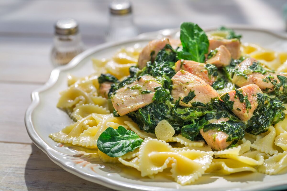 Паста с лососем, грибами и шпинатом. Домашний рецепт.