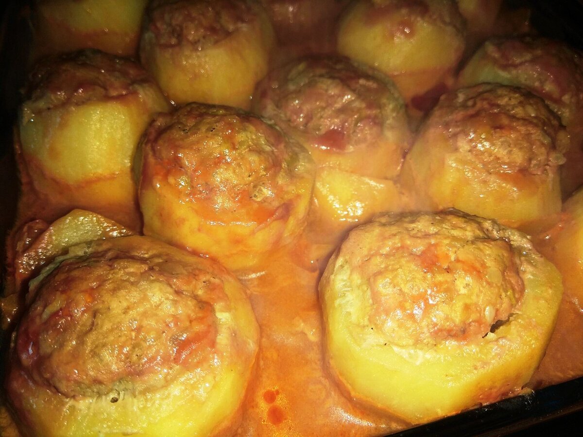 Есть люди, которым легче живется – они любят крупы и едят их с удовольствием…А тут надо вечно голову ломать, потому что царица нашего семейного стола – картошка. И вот вспомнила, что я давненько не запекала в духовке фаршированную. Вот так и поступим! 1.Моем картофель, желательно среднего размера, кругленькую. 2.Чуть отрезаем донышко, чтобы устойчиво стояла. Затем немного срезаем верхушку. И чайной ложкой вынимаю сердцевину. Удаляется она легко круговыми движениями. Стараемся бортики оставлять не толстыми. 3.В стеклянную форму, смазанную маслом, выкладываем все картофельные излишества, солим, перчим, можно пряности любимые добавить. 4. Одну картошку можно добавить в фарш, также лучок, перец черный и красный. + 1 яйцо! Любители могут добавить еще чеснок и зелень. 5. Все! Чайной ложкой заполняем фаршем полученные отверстия в картофеле. Или маленькими колобками раскладываем по ячейкам. Уж кому как удобнее. Желательно фарш класть с горкой. 6.Далее приготовим соус: смешиваем сметану (или