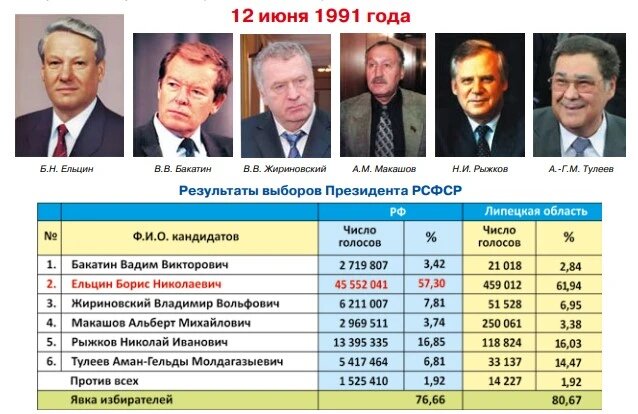 При явке в 69,81% в первом туре Ельцин всего на 3% опередил Зюганова – 35,28% против 32,03%. Это в целом по России. В Липецкой области, входившей в «красный» пояс прокоммунистически настроенных регионов, Ельцин проиграл Зюганову 21% голосов – 25,06% против 46,37%.