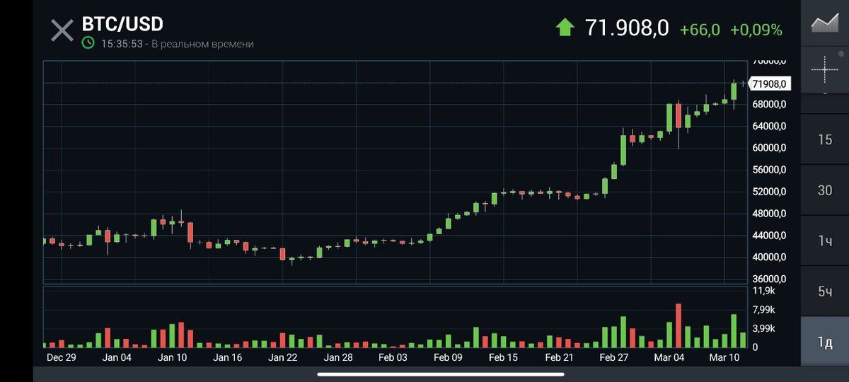 Главная криптовалюта, похоже, закрепилась в зоне исторических рекордов - выше $70 тыс., дойдя сегодня до 72,6 тыс. Дикие скачки курса, кажется, прекратились, и он перешел к более-менее стабильному повышению. Приток денег в американские биткойн-фонды, халвинг (через 35 дней) и ожидаемое увеличение ликивидности в связи со скорым снижением ставки ФРС не оставляют биткойну другого пути кроме роста. Оборона криптоскептиков трещит по швам. В понедельник британский надзорный орган разрешил обращение биржевых облигаций, обеспеченных криптовалютой. Правда, только для профессиональных инвесторов, сохраняя запрет для розничных покупателей. Но и это воспринимается рынком как сигнал к отступлению консерваторов. Криптовалюта медленно, но неуклонно пробивается сквозь их ряды.