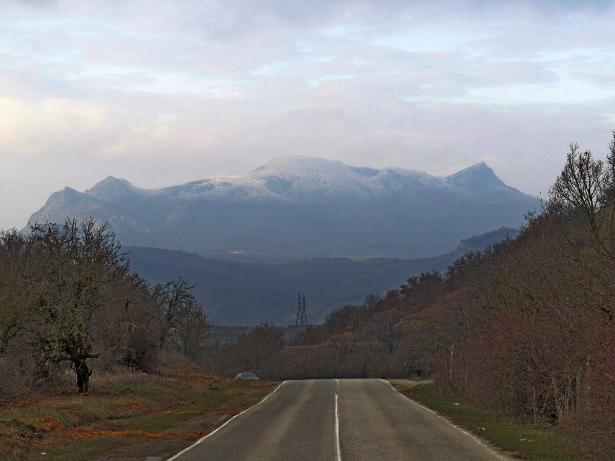Выходной день, 8 марта. Значит надо куда-нибудь выбраться на хорошую прогулку. Вариантов в планах было 2. Либо пройтись к Спящей Красавице, либо через Лисью бухту. Выехали рано. Погода стояла достаточно пасмурная. На подъезде к Коктебелю увидели, что одна из вершин Кара-Дага – Святая, стоит белая! Значит, тучи пришли к нам с холодом. Едем дальше. Вот и Эчки-даг. И тоже красуется в белой шапочке! Так не пойдет! Ведь оба наши варианта находятся поблизости. И поехали мы дальше! Вспомнили, что рядом с нашей Тайной долиной, есть еще две спрятанные небольшие долинки. И в каждой есть небольшие озера. А дорога в одну из них ведет от Зеленогорья. На подъезде к Веселому хоть немного порадовали отдельные цветущие деревца миндаля. Что-то погодка совсем не соответствует празднику! Тучи лежат совсем низко. Просто на вершинах гор. И от снежных вершин ни куда не спрячешься. Поставили машину перед селом, и пошли по грунтовой дороге, петляющей по склону горы. Куда она нас приведет? Дорога очень пр