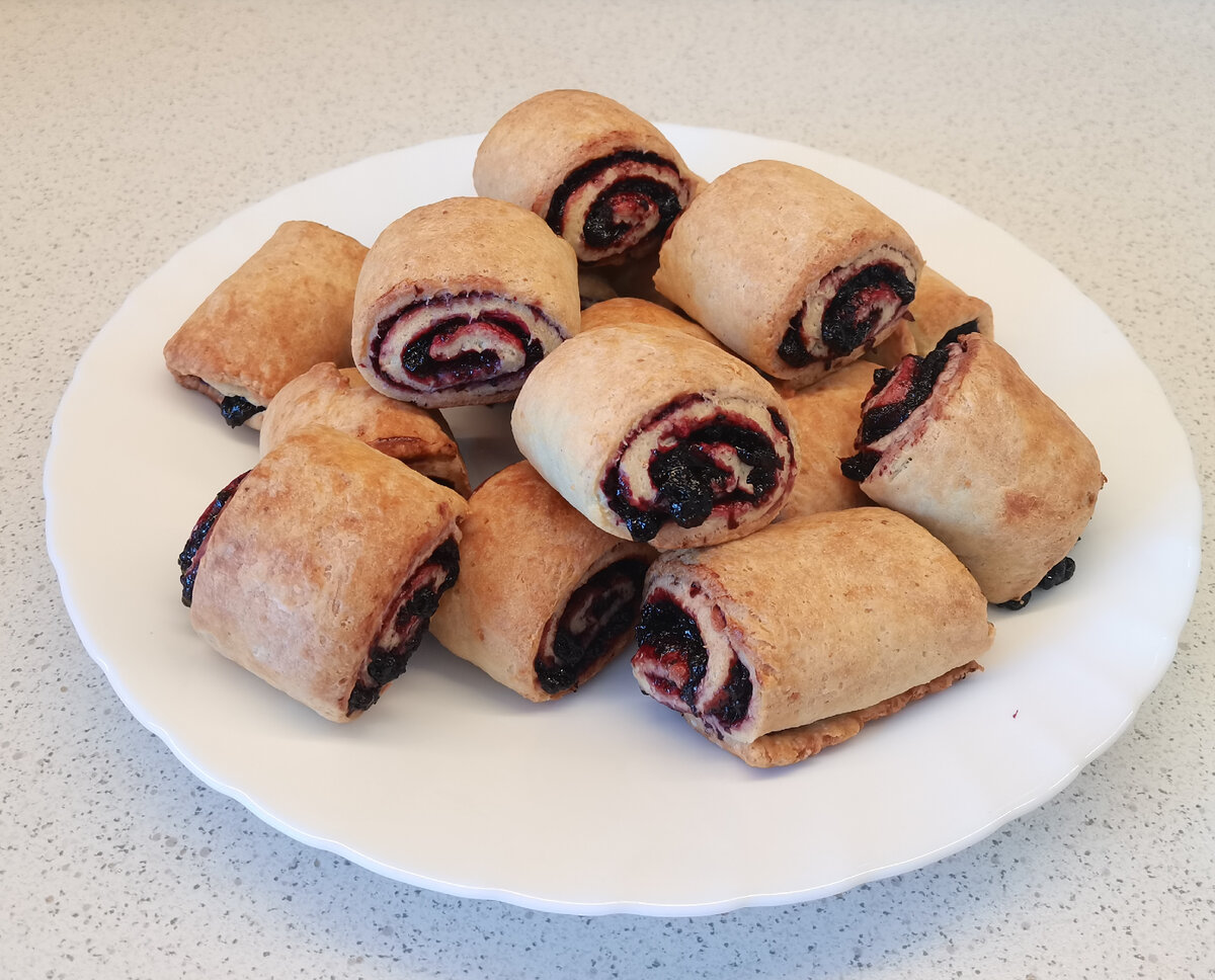 На ~16-18 штук (~ 600г) Тесто: ~ 200г муки 90г сливочного масла 30г сахара (1 ст.л сахара) 1 ч.л разрыхлителя щепотка соли 1 ч.л ванильного сахара 1 яйцо 180г творога Начинка: 150г ягод (у меня замороженная смородина) 70г сахара -(3 ст.л сахара) 1 ч.л крахмала Приготовление теста Смешать муку, разрыхлитель, соль и ванилин, добавить сливочное масло и перемешать до мелкой крошки. Добавить сахар. Смешать творог, яйцо добавить к мучной крошке. Завернуть тесто в пленку и убрать в холодильник на 20-30 минут. Приготовление начинки Замороженные ягоды смородины смешать с сахаром, поставить на огонь и довести до кипения. Далее проварить мин 5. Добавить крахмал, перемешать и проварить еще пару минут. Остудить начинку. Измельчить блендером Формирование печенья Раскатать тесто в прямоугольные пласты, 3-4 мм, выложить начинку, не доходя до верхнего края. Свернуть рулетиком, защипнуть края и аккуратно переложить на доску. Повторить с оставшимся тестом и начинкой. Положить рулеты в