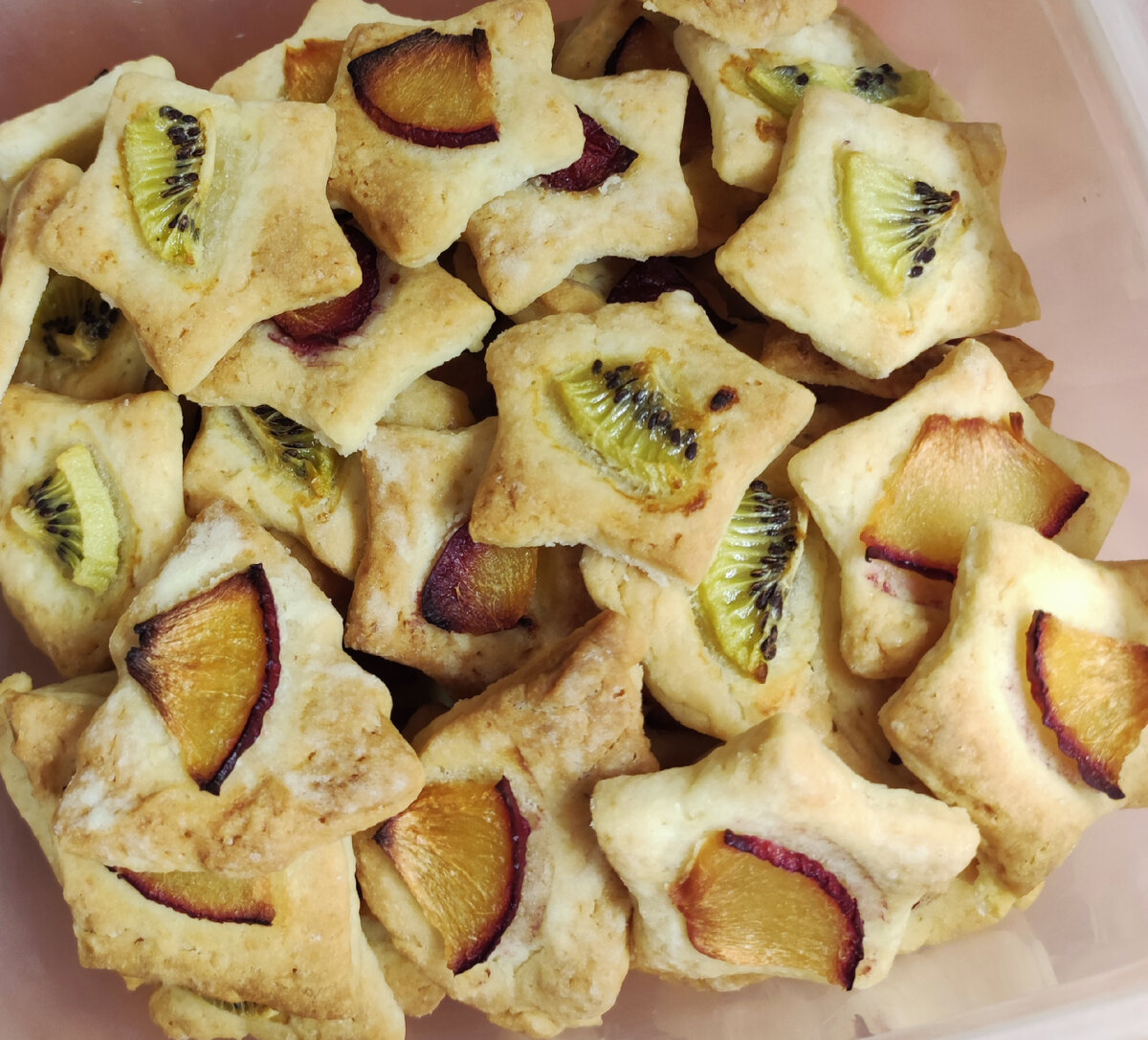 Состав: Пшеничная мука: 400 гр Рассол (от консервированных огурцов): 150 мл Растительное масло: 150 гр Сахар: 8 стол.л. Разрыхлитель: 1 чайн.л. Для украшения: любые фрукты тонко нарезанные. Возьмите большую миску для замеса теста. Влейте в нее рассол, затем всыпьте сахар. Количество сахара можете уменьшить, тогда получится более соленый вариант. Перемешайте рассол с сахаром венчиком. Влейте растительное масло, всыпьте разрыхлитель и снова размешайте. Начните порциями добавлять просеянную муку, вымешивая тесто после каждого добавления. Сначала размешивайте венчиком, затем ложкой. Добавляйте муку частями, учитывая, что его у вас может уйти больше или меньше, чем у меня. В самом конце, когда тесто станет совсем густым, домесите его руками. Тесто получается очень удобным в работе, мягким, не липким и пластичным. Не месите его слишком долго, как только тесто соберется в шар, остановитесь. Выложите тесто на рабочую поверхность, припыленную мукой. Раскатайте его скалкой в пласт толщиной окол