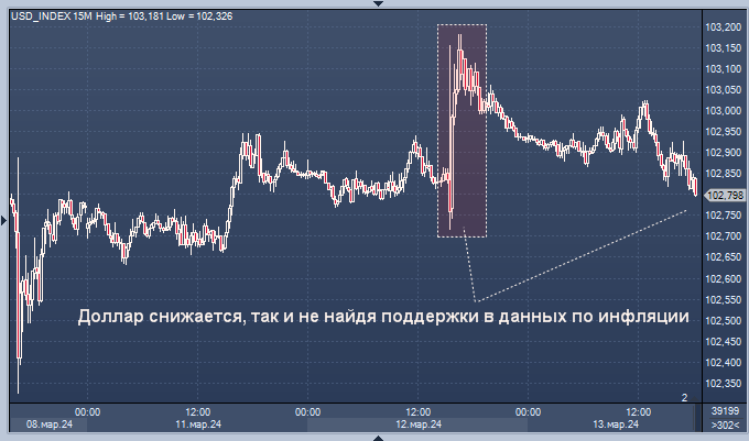 Подъем рынков акций как индикатор риска негативно сказывается на долларе График индекса доллара интервалами в 15 минут Доллар снизился в среду после роста на предыдущей сессии из-за более высоких, чем ожидалось, данных по инфляции в США. Инвесторы консолидировали свои прибыли в преддверии дальнейших экономических данных на этой неделе, которые могут пролить больше света на то, когда Федеральная резервная система начнет снижать процентные ставки в этом году. Индекс потребительских цен (ИПЦ) в США в феврале значительно вырос, превзойдя прогнозы и указывая на некоторую устойчивость инфляции. Хотя индекс потребительских цен в феврале вырос на 0,4% в соответствии с прогнозами, рост на 3,2% в годовом исчислении оказался чуть выше ожидаемого повышения на 3,1%. Базовые показатели также превысили прогнозы. Рынки считают, что вероятность снижения ставки ФРС до лета невелика, однако ожидания снижения ставки в июне немного снизились - до 67% против 71% в начале недели, согласно приложению LSEG "Ве