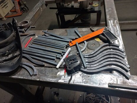 Описание изготовления Ажурного стола. Немножко кованины, много сварки, песен и мата в процессе изготовления. Работа шла по ТЗ, вопросы по дизайну, цвету и "Ваще, кто так делает???" - проходят мимо! Берем квадрат 12 мм... Начинаем неистово гнуть. В горне греем, гнём, стучим, роняем, поднимаем, варим, шлифуем. Из листового металла делаем подушечки, гнем, варим, шлифуем. Внедряем подушечки в каркас который будет под самой столешницей, дабы жесткость конструкции сохранить, но и какого то изящества не потерять. Делаем кондуктор, берем его крепко, иии... И собираем вот такое ... даже обработана слегка. Это ножка если что... комлектуем. Делаем регулируемые подпятники. Токарный станок нам в помощь. Накидываем волну из прутка 6 мм... Продолжаем... Пролистывайте, она страшненькая, на прихватках, забрызганная, не мытая... Золушка наша... зато видно отверстие с резьбой под подпятник. Начинаем сборку. Обрастает наполнением... Выставив в плоскость убеждаемся, что ножки ровные, стройные, одинаково