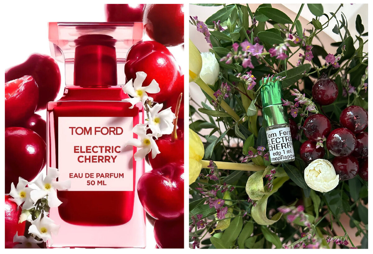 Заказала я, в общем, себе отливанты новинок Tom Ford. Было интересно, поскольку в офлайн магазинах они не представлены, да и не факт, что будут, поскольку сейчас непонятная ситуация с наличием и поставками этого бренда. По моим наблюдениям, основная линейка представлена хорошо и ароматов много, а вот бутиковая линейка (в кубиках) представлена слабо. Сегодня я работаю из дома, поэтому у меня появилась уникальная возможность потестировать целых два аромата и рассказать о них. Начнем с первого лота. Это фланкер нашумевшего Lost Cherry, выпущенный в 2023 году, Electric Cherry. Electric Cherry (Электрическая Вишня) от Tom Ford - родная сестра Lost Cherry, имеющая более звонкий, невесомый, искристый характер. Композиция стартует ярким дуэтом вишня и имбиря, придающим вишневой форме изысканное холодноватое содержание. В сердце парфюмерной мелодической линии играет душистый жасмин, а завершает звучание переплетение аккордов мягкого мускуса, теплого розового перца и одоранта амбреттолида, нав