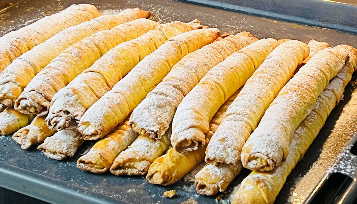 Как же это вкусно. Тающий во рту нежнейшее печенье к чаю. Чудесная выпечка с роскошной начинкой, которая подходит как на каждый день, так и идеально подходит на любой праздничный стол. Съедаются мгновенно. Для начала надо приготовить простое песочное тесто по рецепту и отложить в холодильник , за это время приготовить начинку у нас две начинки это грецкие орехи с сахаром и корицей и сладкая масляная крошка, где масло сахар и мука всё перемешать и начинка готова. Достать тесто из холодильника, разделить на 20 порций, раскатать в тонкий пласт, с одного края выкладываем начинку и завернуть в рулетик, в трубочку, переложить на противень и в духовку 180 градусов 20 минут, оставить остыть сверху посыпать сахарной пудрой можно подавать на стол к чаю. Ингредиенты; 1 яйцо сахар - 70 г сметана - 150 г сливочное масло - 100 г мука - 300 г соль. ванилин разрыхлитель - 1 ч л Начинка: грецкие орехи - 70 г сахар - 50 г корица - 05 ч л сл. масло - 40 г сахар - 40 г мука - 40 г ванилин #кулинария#вып