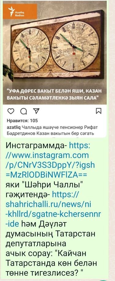 Сәгатьне күчерсеннәр иде- https://www.instagram.com/p/CNrV3S3DppY/?igsh=MzRlODBiNWFlZA== яки https://shahrichalli.ru/news/ni-khllrd/sgatne-kchersennr-ide һәм дә тулырак мәгълүмат https://ok.ru/group/55566116061259/topic/156655034650699 . Законодательно перевести Республику Татарстан в часовую зону МСК+1 https://www.change.org/p/москва-плюс-один-час-равняется-казань?recruiter=972238874&recruited_by_id=ddffdb80-89fb-11e9-b15c-d315a7d7e49b&utm_source=share_petition&utm_campaign=share_for_starters_page&utm_medium=vk . Подробнее об этом- https://dzen.ru/a/Y5wuEadiOxvY9HmU?referrer_clid=1400& . Мои контакты: https://avatars.dzeninfra.ru/get-zen_doc/271828/pub_604a72046257184ecb0b07ab_65d48547ce4d2a4c9f61f8bd/scale_1200 и rifat.badertdinoff@yandex.ru