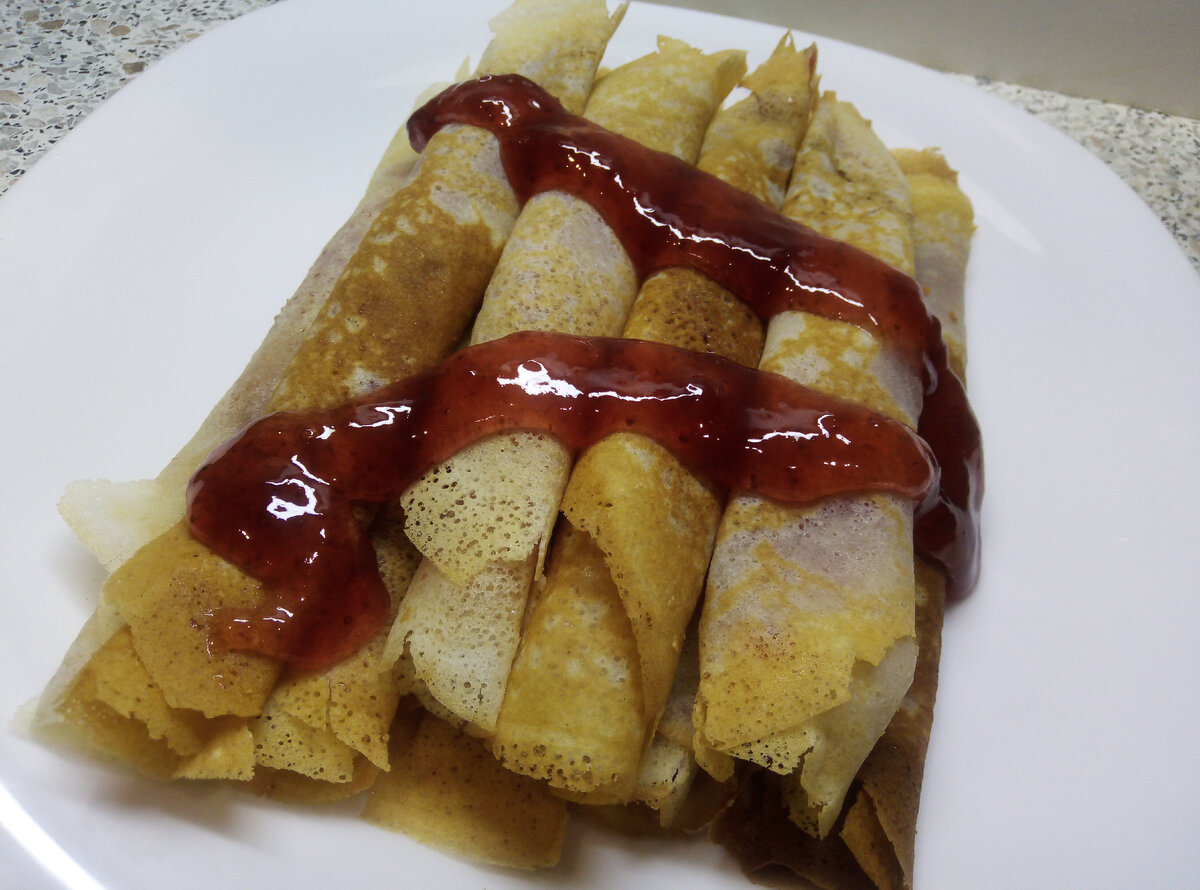 Вам понадобится : Клубничный джем 1 шт Молоко 2 стакана Кефир 2 стакана Яйцо 3 шт Разрыхлитель 1 шт Ваниль 1 шт Масло постное 70 грамм Мука 250 грамм, смотрите Сахар 150 Тесто хорошо смешать Блины выпекать на горячей сковороде смазанной подсолнечным маслом Блины выпекать и складывать на тарелочку и смазывать сливочным маслом блины мазать джемом клубничным Хорошо распределите джем Блины скручиваем и складываем на тарелочку Это очень вкусно Сверху блины тоже намажьте клубничным джемом Это очень вкусный рецепт Желаю вам приятного аппетита. Просим вас принять участие в голосовании за лучший рецепт. Подпишитесь. Ваш голос важен для нас. Напишите комментарий. Поделитесь рецептом с друзьями и подписчиками в соц сетях.
