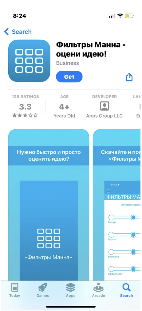 Но если нет бюджета на это, то на помощь придет грамотная работа с ASO. В качестве примера возьмем приложение “Фильтры Манна”, которое позволяет оценить идею по определенным критериям, чтобы понять – стоит ее реализовывать или нет. Скачивания п
