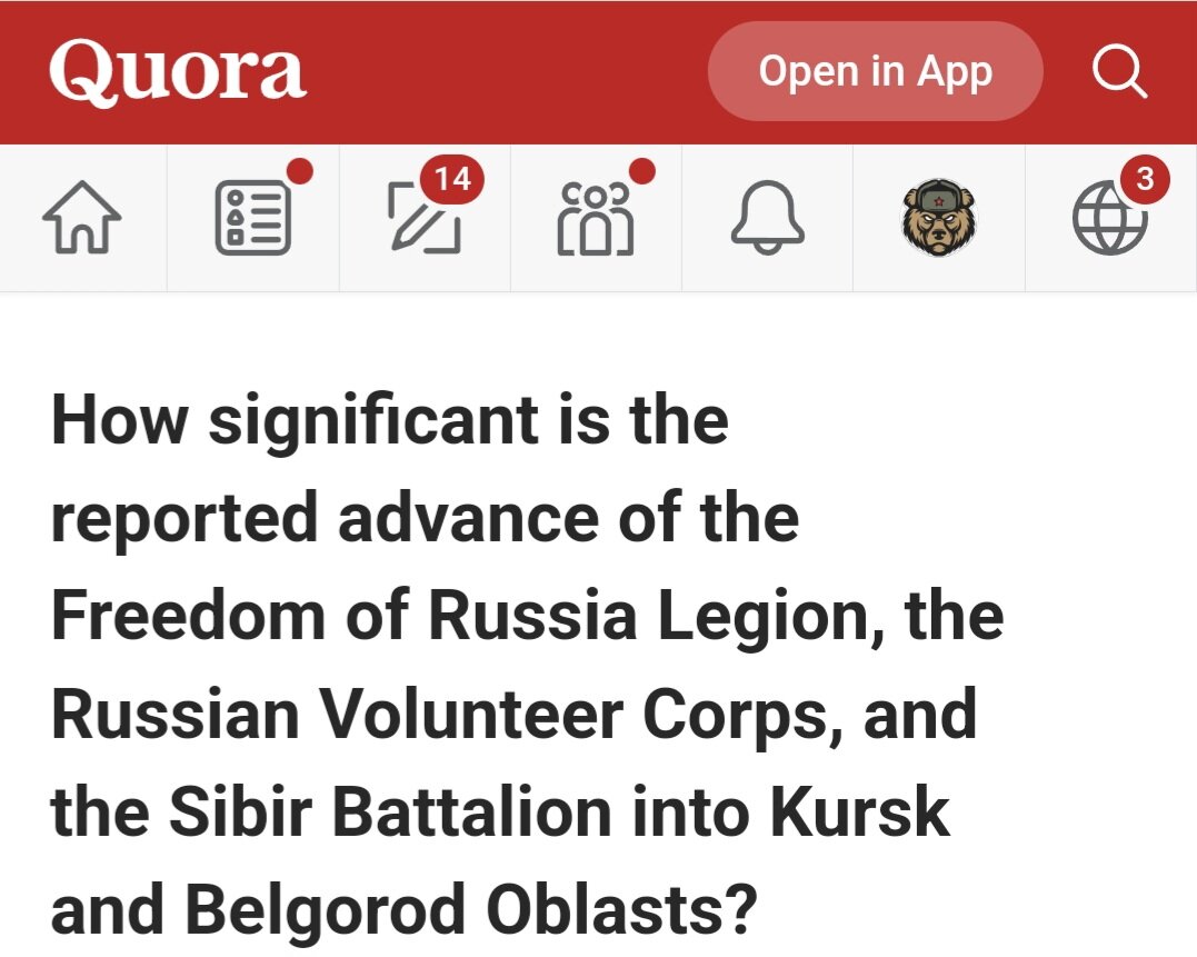 "Насколько значительны сообщения о продвижении Легиона «Свобода России», Российского добровольческого корпуса и батальона «Сибирь» в Курскую и Белгородскую области?" ××× Карл Гамильтон, Дания. Эта акция является пиар-ходом, а вовсе не "продвижением". По сути, это не очень удачная для ВСУ стычка на пограничном пункте, и это тоже не первый бой там. За этим последовало фейковое заявление о том, что войска ВСУ находятся глубоко на территории России, подкрепленное видео пары солдат на пустой улице. К их сожалению, эти кадры сняты из украинского села Рыжевка в Сумской области, которое еще в 2022 году было оккупировано русскими и аналогичным образом использовалось в пропагандистских целях. При попытке пересечения границы, которая была заснята почти полностью, два их танка Т-64БВ обстреляли пустое здание и два случайных объекта, после чего были выведены из строя подрывом на мине, а затем уничтожены отрядом чеченской национальной гвардии гранатой с беспилотника. По моим оценкам, этому Т-64БВ у