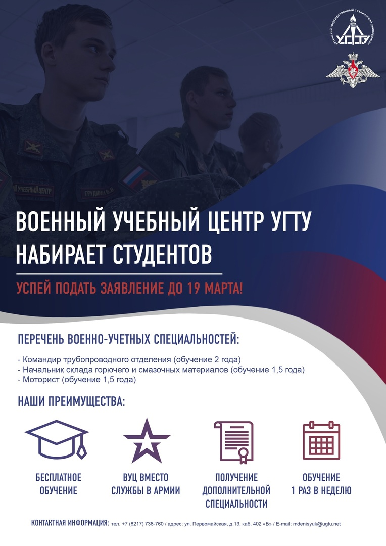 Прием документов в ВУЦ УГТУ продлен до 19 марта До 19 марта идет прием заявлений кандидатов на поступление в Военный учебный центр при Ухтинском государственном техническом университете. Заявление студентам необходимо предоставить в деканат своего факультета.