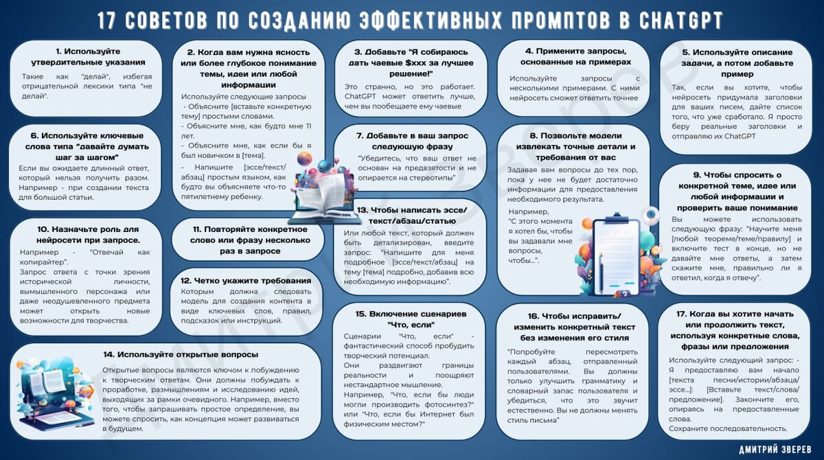 Есть несколько советов по созданию эффективных промптов. Я попросил нейросеть ChatGPT написать их в виде коротких анекдотов. Поехали. ChatGPT, воодушевленный, начинает отвечать, но вдруг спрашивает: "А ты знаешь, что я предпочитаю биткоины? Шучу, шучу, дайте мне тот промпт, я уже вижу себя богатым и известным ИИ!" ChatGPT отвечает: "Хорошо, сначала мы включаем мой процессор. Шаг второй: надеемся, что у нас есть достаточно оперативной памяти. Шаг третий: молимся, чтобы не было обновлений в середине нашей работы. И вот теперь, после всех этих шагов, мы можем начать писать статью!" При составлении длинного ответа пользователь указывает: "давайте думать шаг за шагом". ChatGPT отвечает: "Хорошо, сначала мы включаем мой процессор. Шаг второй: надеемся, что у нас есть достаточно оперативной памяти. Шаг третий: молимся, чтобы не было обновлений в середине нашей работы. И вот теперь, после всех этих шагов, мы можем начать писать статью!" ChatGPT отвечает: "Хорошо, сначала мы включаем мой процес