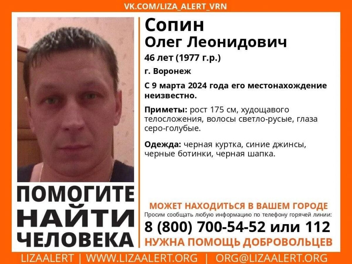 В Воронежской области волонтеры разыскивают без вести пропавшего 46-летнего мужчину с серо-голубыми глазами. Об этом сообщили в поисково-спасательном отряде «Лиза Алерт». Местонахождение Олега Сопина неизвестно с 9 марта 2024 года. Пропавший проживает в Воронеже. Рост мужчины 175 см, худощавого телосложения, у него светло-русые волосы и серо-голубые глаза. Пропавший был одет в черную куртку, синие джинсы, черные ботинки и черную шапку. Воронежцев просят помочь в поисках мужчины. Если вы знаете что-либо о местонахождении пропавшего, сообщите по телефонам: горячей линии отряда 88007005452 (бесплатно по РФ) или 112.