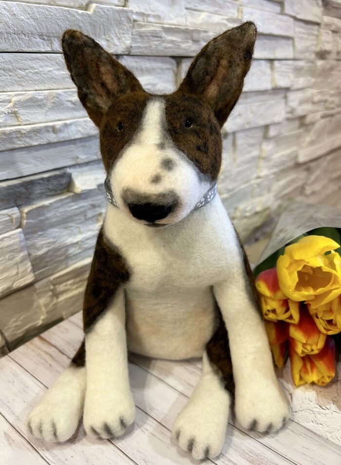 Всем привет.Захотелось поделиться с вами своей последней работой - бультерьером Бубликом. Запрос был на песика размером 25-30 см. Для валяния, я считаю, это прям огромная игрушка. Учитывая, что на малышей я трачу 3-4 вечера, тут пришлось попотеть от души. Я не делаю реалистичных животных. Во-первых, банально пока не умею, во-вторых, мне самой по душе более мультяшные что ли. До последнего не могла решить, делать ли ему когти. Уже даже их вылепила, но после примерки решила не добавлять. В общем, получился, вроде бы, добрый такой детский буль. Надеюсь, его полюбят в новом доме) Пост автора BestTanchik. Узнать, что думают пикабушники.