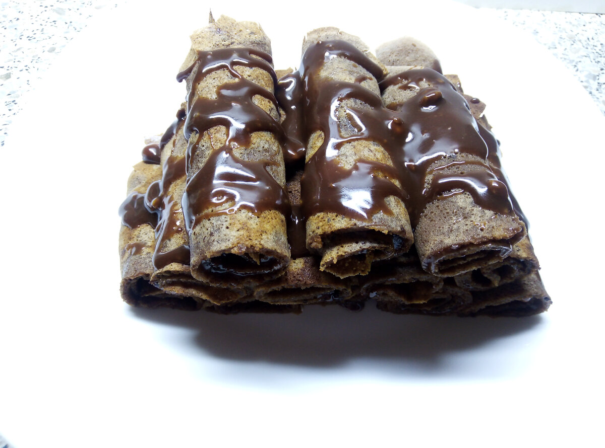 Вам понадобится : Мука - 300 грамм(смотрите по тесту) Яйцо 3 шт Молоко 500 грамм Кефир 250 грамм Разрыхлитель Ваниль Сахар 200 грамм Какао 50 грамм Масло постное 70 грамм Шоколад 100 грамм с орехом В молоко положить 3 яйца И Кефир Добавляем разрыхлитель и ваниль, ложим какао и муку Хорошо смешайте и положите сахар Хорошо смешайте и положите масло Хорошо смешайте На смазанную сковороду вылейте маленький блин Поджарьте и далее жарьте обычно. Готовые блины выложить на тарелочку и смазать сливочным маслом - хорошего качества. Блины разрезать на две части Шоколад 100 грамм с орехом, растопить с добавлением 2 ст. Ложек молока. Далее Нарежьте блины шоколадом Свернуть в трубочку Это очень вкусно Полить шоколадом Очень, очень вкусно Желаем вам приятного аппетита. Просим вас принять участие в голосовании за лучший рецепт. Подпишитесь. Ваш голос важен для вас. Напишите комментарий. Поделитесь рецептом с друзьями и подписчиками в соц сетях.
