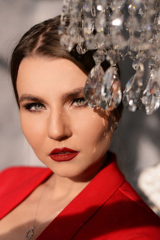 Девушка в красном костюме выглядит привлекательно и стильно. Её длинные волосы могут быть либо собраны в аккуратный пучок, либо развеваются в мягких волнах вокруг лица, придавая образу женственность. У неё изящные черты лица: мягкие, но выразительные глаза, излучающие уверенность и тепло; аккуратный нос и четкая форма губ. Её улыбка обаятельна и светла.